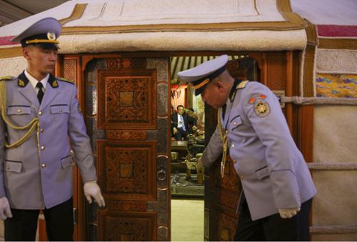 就在这间蒙古包里,7月14日上午,李克强总理与蒙古国总统额勒贝格道尔吉进行了“超时近20分钟”的会见。此间外交人士解读,此次会见“具有引领亚欧首脑会议内容的含义”。中新社 刘震 摄