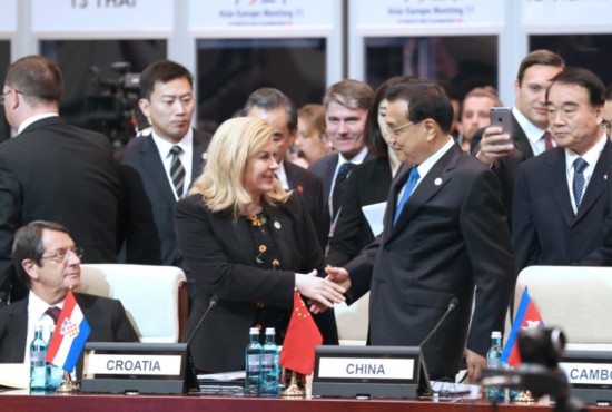 7月15日上午,第十一届亚欧首脑会议上,李克强总理与克罗地亚总统基塔罗维奇握手交谈。新华社 马占成 摄