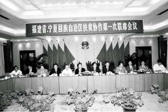 1996年11月,闽宁扶贫协作第一次联席会议在福建召开,会议确定:两省区政府每年举行一次联席会议;建立扶贫协作发展基金;从沿海5个省辖市中选出8个经济实力较强的县(市、区),对口帮扶宁夏8个国家扶贫开发工作重点县;互派挂职干部;部门对口协作。图为习近平(右五)出席闽宁扶贫协作第一次联席会议。 新华社记者 刘泉龙 摄