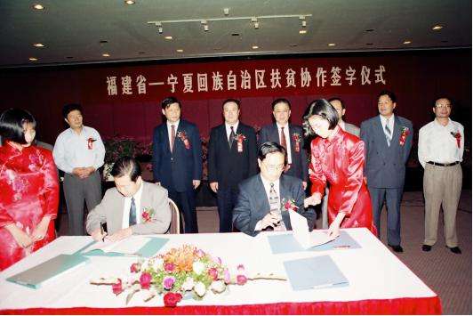 1996年11月,时任福建省委副书记、福建省对口帮扶宁夏领导小组组长的习近平在福建出席闽宁扶贫协作签字仪式。 新华社记者 刘泉龙 摄