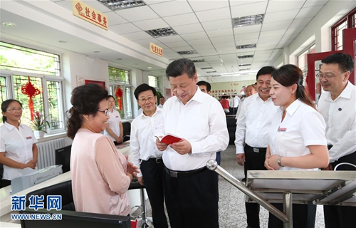 7月28日,中共中央总书记、国家主席、中央军委主席习近平到河北唐山市调研考察。这是习近平在唐山市祥富里社区服务中心政务服务大厅同办事群众交流。新华社记者 兰红光 摄