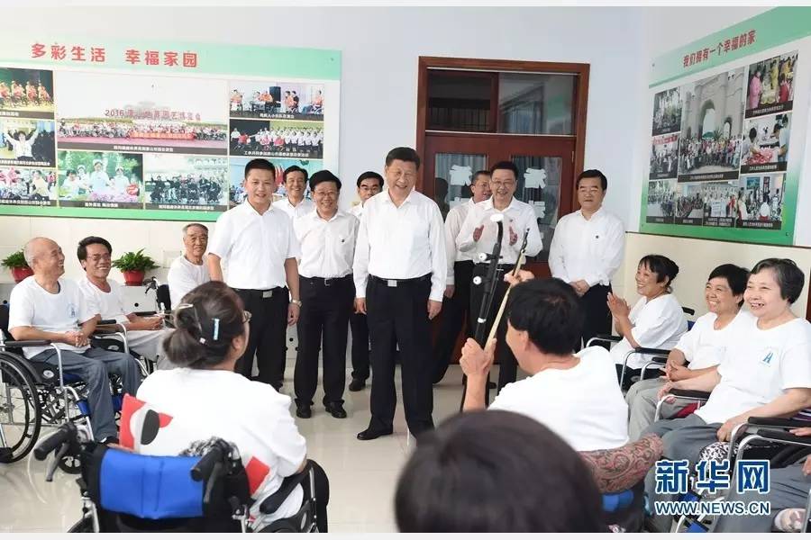 图为:2016年7月28日,中共中央总书记、国家主席、中央军委主席习近平到河北唐山市调研考察。这是习近平在唐山市截瘫疗养院活动室欣赏截瘫伤员表演的二胡伴唱《唱支山歌给党听》。