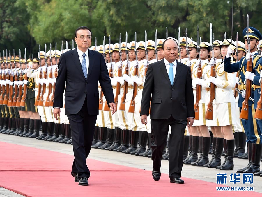 9月12日,国务院总理李克强在北京人民大会堂同来华进行正式访问的越南总理阮春福举行会谈。这是会谈前,李克强在人民大会堂东门外广场为阮春福举行欢迎仪式。 新华社记者 李涛 摄
