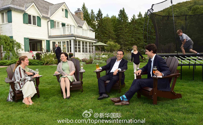 新华网北京9月22日电 当地时间21日傍晚,李克强总理抵达加拿大两小时后,就在渥太华的哈灵顿湖总理官邸出席加拿大总理特鲁多夫妇举行的家宴。餐前,两国总理夫妇在官邸门外的湖边小坐交谈。一顿三道菜的简单晚餐后,两国总理夫妇返回湖边,欣赏晚霞景色并继续交流。 (据新华社“新华国际”微博报道)