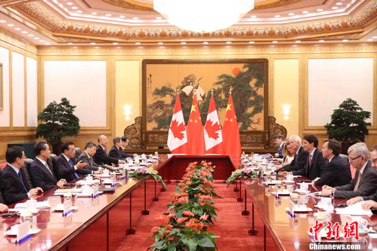 资料图:8月31日,中国国务院总理李克强在北京人民大会堂与来华进行正式访问并出席二十国集团领导人杭州峰会的加拿大总理特鲁多举行会谈。中新社记者 刘震 摄