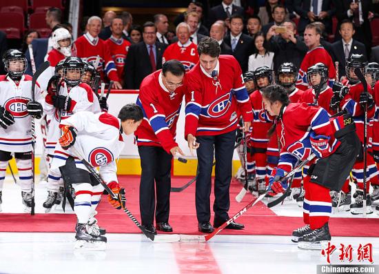 当地时间9月23日,到访蒙特利尔的中国国务院总理李克强在加拿大总理特鲁多陪同下,参观当地“加拿大人”冰球队,获赠印有他名字的球衣。李克强穿上球衣,与特鲁多一起为参加训练的小球员开球。中新社记者 刘震 摄