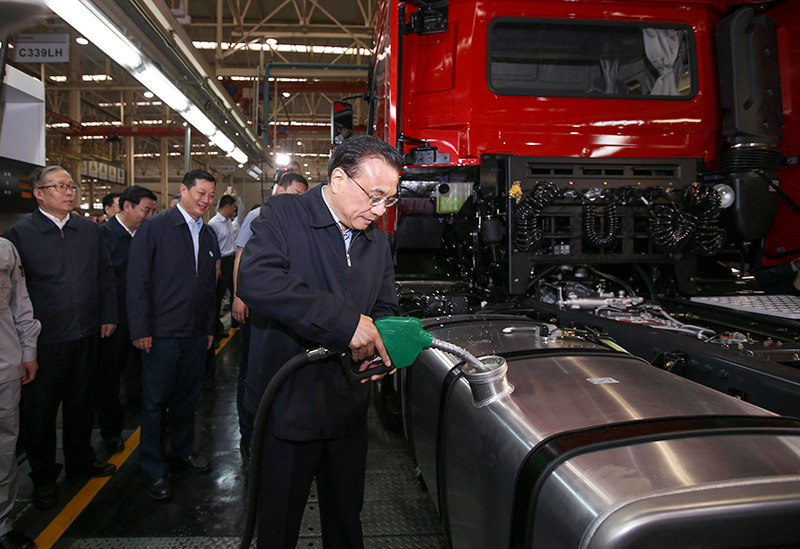 2016年5月23日,李克强到湖北十堰考察东风商用车重卡新工厂,在装配生产线旁应邀为新型重卡加油。(资料图)