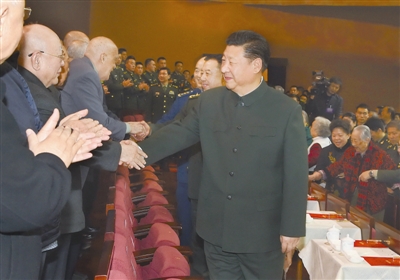 下午3时30分许,习近平来到老同志们中间,全场响起热烈掌声。习近平同大家亲切握手,关切地询问他们的身体和生活情况,共同回顾过去一年党、国家和军队事业发展的辉煌历程,展望强国强军的美好前景。老同志们表示,要更加紧密地团结在以习近平同志为核心的党中央周围,牢固树立政治意识、大局意识、核心意识、看齐意识,不忘初心、继续前进,积极支持实现强军目标、建设世界一流军队的事业,满怀信心迎接党的十九大胜利召开。
