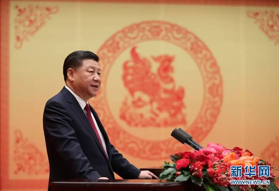 图为:2017年1月26日,中共中央、国务院在北京人民大会堂举行2017年春节团拜会。中共中央总书记、国家主席、中央军委主席习近平发表重要讲话。