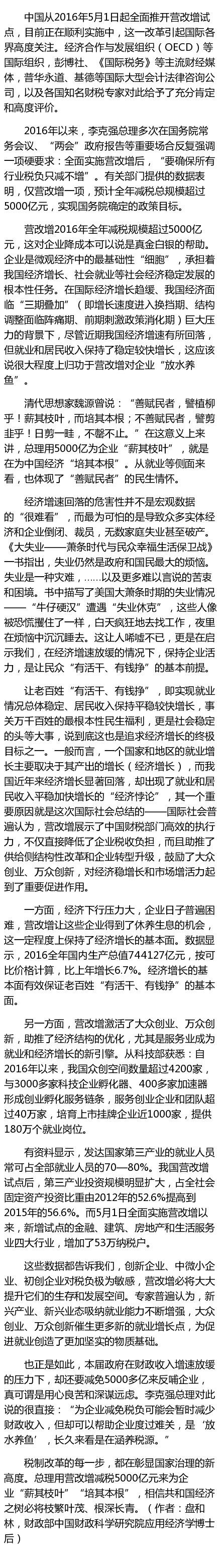 税制改革的每一步,都在彰显国家治理的新高度。总理用营改增减税5000亿元来为企业“薪其枝叶”“培其本根”,相信共和国经济之树必将枝繁叶茂、根深长青。