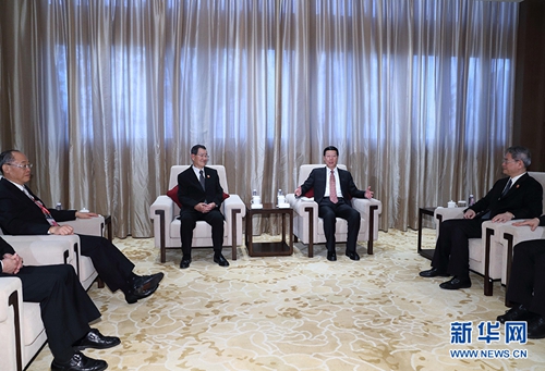 3月24日,中共中央政治局常委、国务院副总理张高丽在海南博鳌会见出席博鳌亚洲论坛2017年年会的台湾两岸共同市场基金会荣誉董事长萧万长一行。新华社记者王晔摄