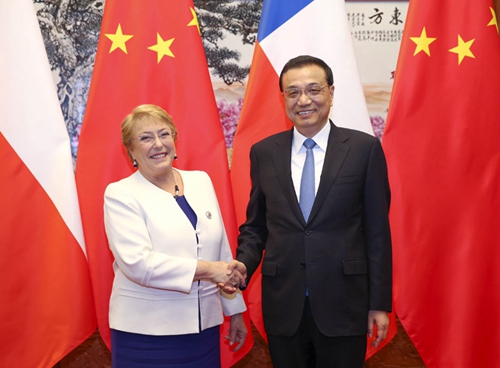 国务院总理李克强5月14日下午在人民大会堂会见来华进行国事访问并出席“一带一路”国际合作高峰论坛的智利总统巴切莱特。