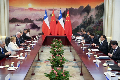 李克强表示,中智关系长期走在中国同拉美国家关系的前列。昨天,习近平主席同总统女士举行富有成果的会谈,为中智关系发展展现出更加广阔的前景。中方愿同智方加快发展战略对接,扩大全方位交往,拓展重点领域合作,打造中智自贸区升级版,向国际社会共同发出推进经济全球化、支持贸易投资自由化便利化、反对保护主义的积极信号,促进地区和世界的和平稳定与发展繁荣。