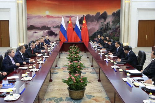 李克强表示,当前中俄全面战略协作伙伴关系继续保持高水平发展。习近平主席同总统先生举行了富有成果的会晤,又达成许多新的共识。中方愿同俄方乘势而上,扎实推进两国金融、地方、农业、能源、民用航空等领域现有合作,进一步发挥互补优势,挖掘合作潜力,构筑大项目带动、中小企业和创新型企业共同助推的合作新格局,密切人文交流,推动中俄合作取得更多新成果。