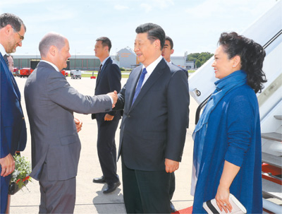 七月六日,国家主席习近平乘专机抵达德国汉堡,出席二十国集团领导人第十二次峰会。习近平和夫人彭丽媛在汉堡机场受到汉堡市市长肖尔茨的热情迎接。