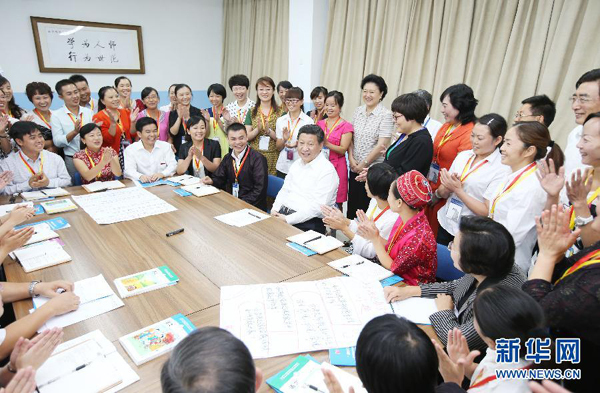 2014年9月9日,习近平来到北京师范大学看望教师学生,向全国广大教师和教育工作者致以崇高的节日敬礼和祝贺。这是习近平同正在北师大参加“中小学教师国家级培训计划”的贵州小学骨干语文教师交流。
