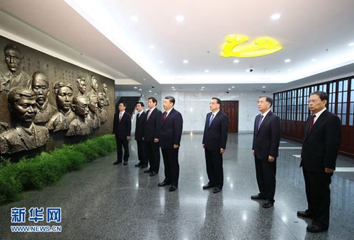 纪念馆宣誓厅,悬挂着巨幅中国共产党党旗。面对党旗,习近平带领其他中共中央政治局常委同志一起重温入党誓词。在习近平领誓下,铿锵有力的宣誓声响彻大厅,让现场所有人都深受感染,仿佛回到了那个风雨如磐的年代。习近平强调,入党誓词字数不多,记住并不难,难的是终身坚守。每个党员要牢记入党誓词,经常加以对照,坚定不移,终生不渝。