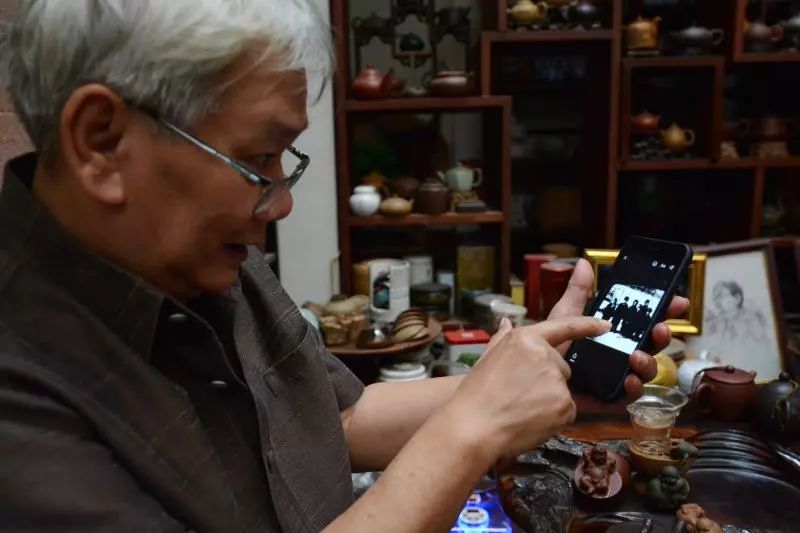 图为萨马诺·奔舍那向记者展示老照片(刘艾伦摄)