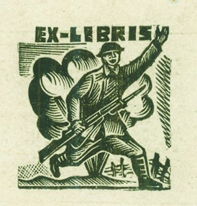 这款是印在1939年唐英伟在香港出版的木刻集《中国的血》封底的藏书票。1931年鲁迅提倡新兴木刻运动,唐英伟是最早投入中国现代木刻运动的美术家之一。他的木刻画甚至被认为是“代表劳苦大众申诉的作品”。1938年唐英伟来到香港,那时正处于抗日战争激烈时期,他在香港以版画为笔,号召同胞抗日,但仍不忘情于藏书票创作。许地山为该书题签:“愿将此中的一切永刻在人人底心版上。”这款表现奔赴沙场战士的藏书票,就是最好的见证。(怀安 辑)