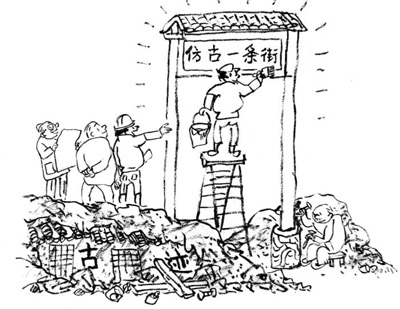 历史是一次性的。如果毁掉,永远不会再生。可是当城市的历史遗存差不多拆光,偏偏又要开展旅游了,拿什么给人看?独特的历史文化是城市最重要的旅游资源——可是等明白过来为时已晚,世上没有后悔药,只有一个办法,就是仿古造假。于是,“仿古街”(如“明清一条街”)应运而生。