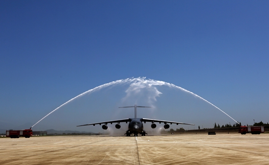 2016年7月6日,运-20飞机滑过水门接受洗礼,官兵用最隆重的仪式欢迎“鲲鹏”参军入伍。刘畅/摄(资料照片)