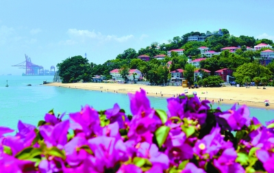 三角梅掩映下的鼓浪屿海边沙滩。新华社发