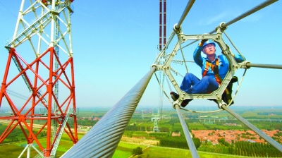 党的十九大代表、国网山东电力检修公司带电班副班长王进在扎鲁特—青州±800千伏特高压直流输电工程黄河大跨越段进行走线验收。新华社发