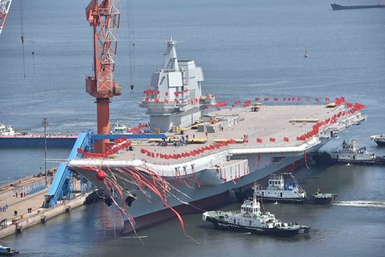 2017年4月26日,我国第二艘航空母舰下水仪式在中国船舶重工集团公司大连造船厂举行。图为航空母舰在拖曳牵引下缓缓移出船坞,停靠在码头泊位。视觉中国供图