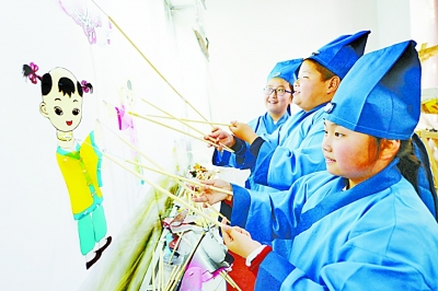 山东青岛芙蓉山小学皮影艺术社团的孩子们正在表演自己创作的皮影戏。新华社发