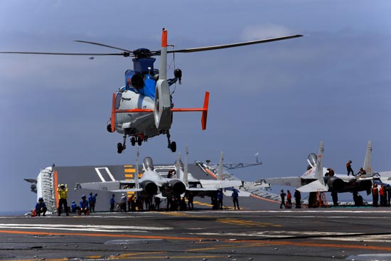 4月26日,辽宁舰航母编队圆满完成远海实兵对抗训练,返回青岛航母军港。在连续10多天高强度和高难度的实兵对抗演练中,航母编队体系作战能力得到进一步强化、提升和检验。图为4月21日,舰载直升机飞行归来。视觉中国供图