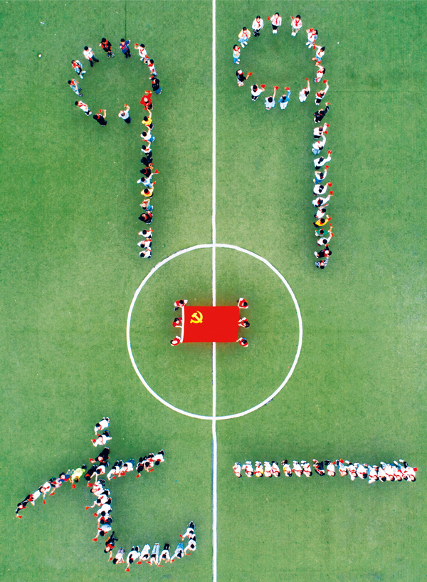 2020年6月30日,江苏省泰州市大冯中心小学开展“童心向党迎七一”主题班会,通过给学生上党课、讲党史等方式,让学生了解党的光辉历程,迎接中国共产党建党99周年。图为活动中摆出的“七一”、“99”和党旗的组合图案。 中新社发 汤德宏/摄