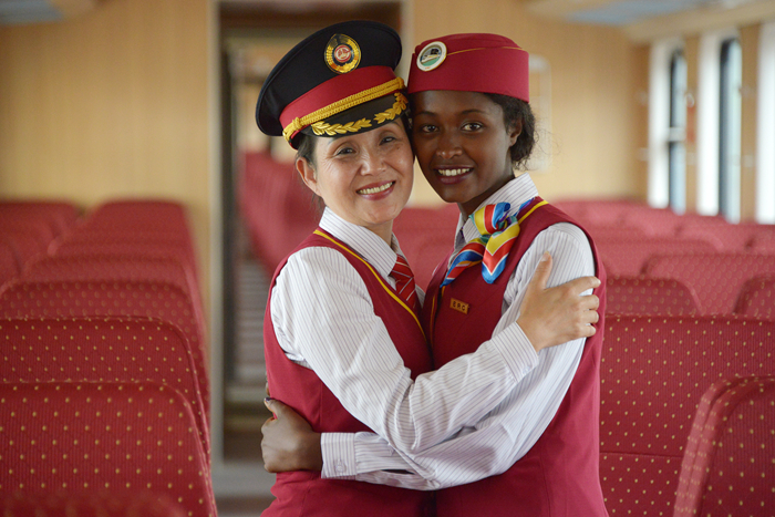 2016年10月1日,在埃塞俄比亚首都亚的斯亚贝巴拉布车站,中方列车长丁继华(左)和埃塞俄比亚乘务员沃克内什·贝特鲁拥抱。新华社记者 孙瑞博 摄