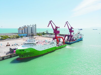 我国首艘全数配备国产化科考作业设备的载人潜水器支持保障母船——“探索二号”船抵达三亚崖州湾科技城南山港。新华社发