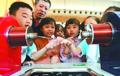 河北省沧州市路华小学学生在“流动科技馆”体验“铁钉桥”。新华社发