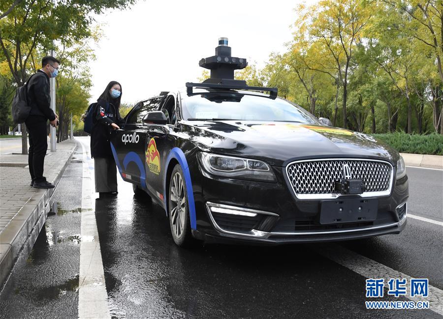 市民在北京市海淀区稻香湖路的百度自动驾驶出租车指定上车点乘车(10月14日摄)。新华社记者 任超 摄