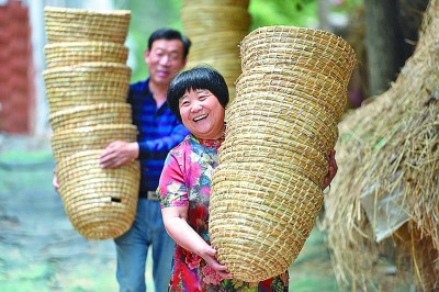 山东临沂市郯城县马头镇草编合作社社员在搬运用秸秆编制的工艺品。
