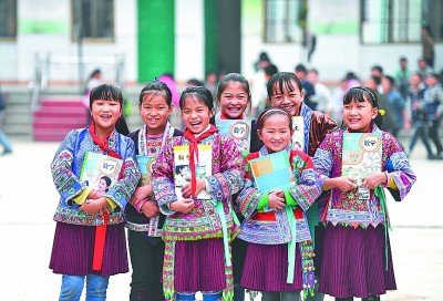 广西融水苗族自治县白云乡中心校学生领取教材。本文照片均为新华社发