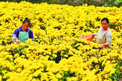 贵州省黔南布依族苗族自治州龙里县洗马镇金溪村以“公司+合作社+农户”方式,通过产业扶贫实现脱贫。图为当地村民在采摘金丝皇菊。新华社发