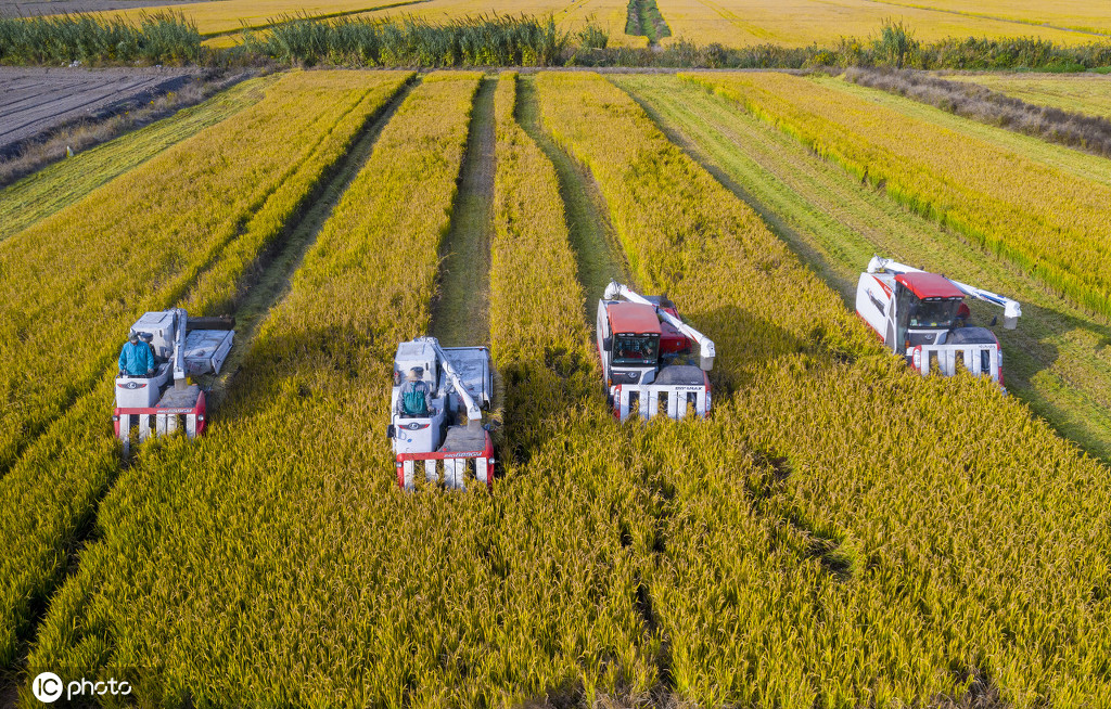 2020年10月29日下午,江苏省南通开发区的万顷良田优质南粳46水稻农田里,数台大型现代化收割机正进行水稻收割作业。图片来源:东方IC
