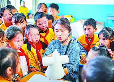 江西省上饶市万年县汪家中心小学教师给学生讲解圆锥模型。徐声高摄/光明图片