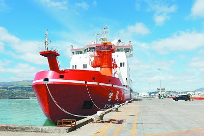 “雪龙2”号停靠新西兰港口进行无接触补给。新华社发