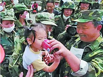 2008年5月15日,人民子弟兵在给刚刚从北川地震灾区救出的儿童喂饮料。新华社发