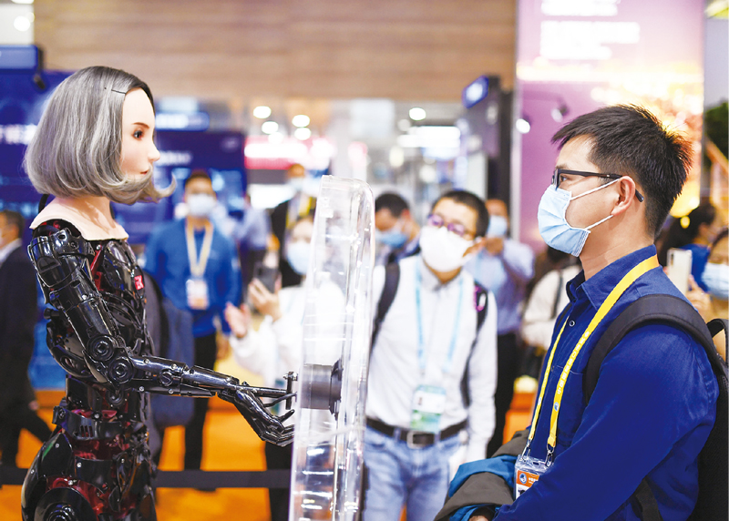中国国际进口博览会,是世界上第一个以进口为主题的国家级展会,是中国主动向世界开放市场的重大举措。2020年11月5—10日,第三届进博会在上海成功举行。图为11月6日,在技术装备展区,一名观众与EX仿生机器人对视。 新华社记者 李任滋/摄