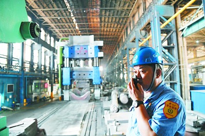 在中国一重的生产车间内,劳动模范刘佰鸣在15000吨水压机旁指挥作业。近年,中国一重为刘佰鸣等技术能手成立了“劳模创新工作室”,把工匠技艺和劳模精神传承下去。新华社发