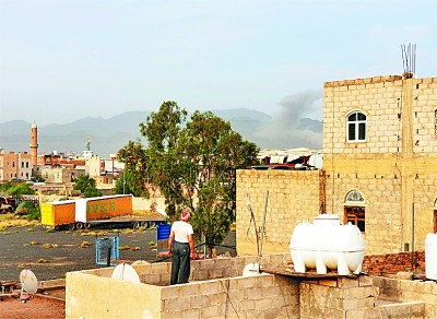 6月16日,也门首都萨那遭沙特阿拉伯领导的多国联军战机多次空袭。图为萨那居民在屋顶望着空袭后升起的浓烟。新华社发