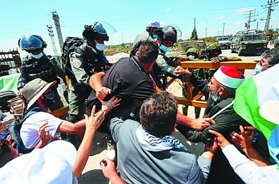8月21日,在约旦河西岸城镇塞勒菲特附近的基夫勒哈里斯,参加抗议活动的巴勒斯坦人与以色列士兵、边境警察冲突。新华社发