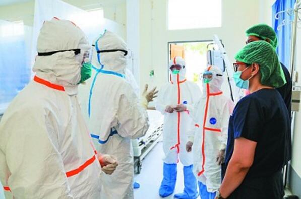 4月10日,在缅甸仰光北奥卡拉帕医院,中国援缅抗疫医疗专家组调研该院发热诊区。新华社发