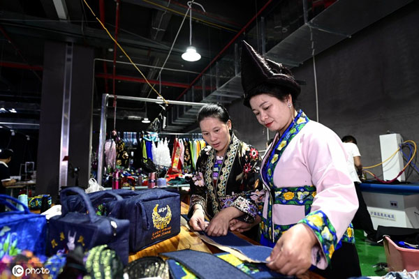2020年9月22日,在贵州省从江县美娥安置点,工人在祖英刺绣扶贫车间赶制手包。图片来源:ICphoto