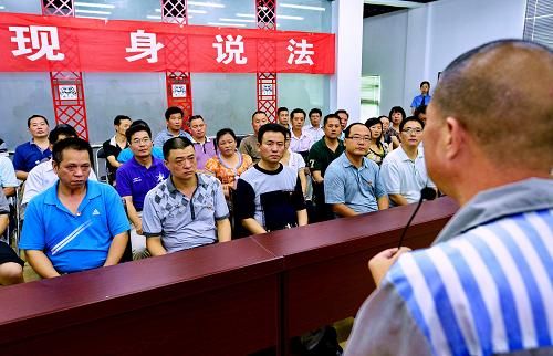 7月5日,一名经济犯罪服刑人员(右一)在武夷山市反腐倡廉警示教育基地现身说法。近年来,福建省南平市纪委依托武夷山监狱建立反腐倡廉警示教育基地,通过典型腐败案例,在全市党员干部中开展“用身边的案例教育身边的人”警示教育活动。从2012年6月以来,前来这里接受警示教育的党员干部达3000多人次。新华社记者 张国俊 摄