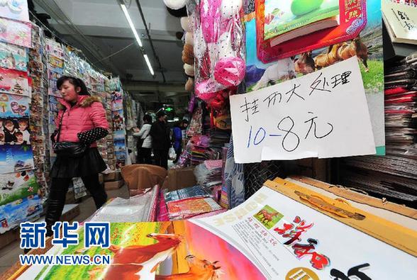 12月18日,银川市东方商城一家主营台历贺卡的商铺挂出了打折处理的牌子吸引顾客。 “公款贺卡”禁令出台后,宁夏银川年历贺卡市场销售遇冷,单位、企业大量购买贺年卡、年历、明信片的情况今年基本消失,顾客以散客为主。银川市各商城内销售贺卡年历的商家生意冷清,部分商家开始降低零售价格。 新华社记者 彭昭之 摄